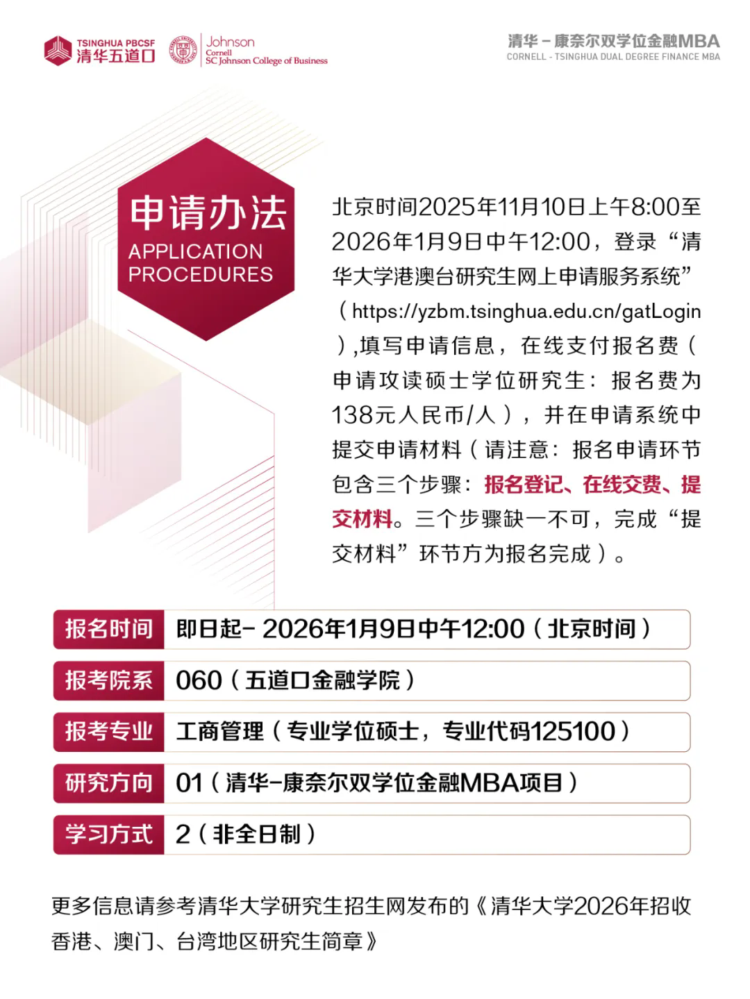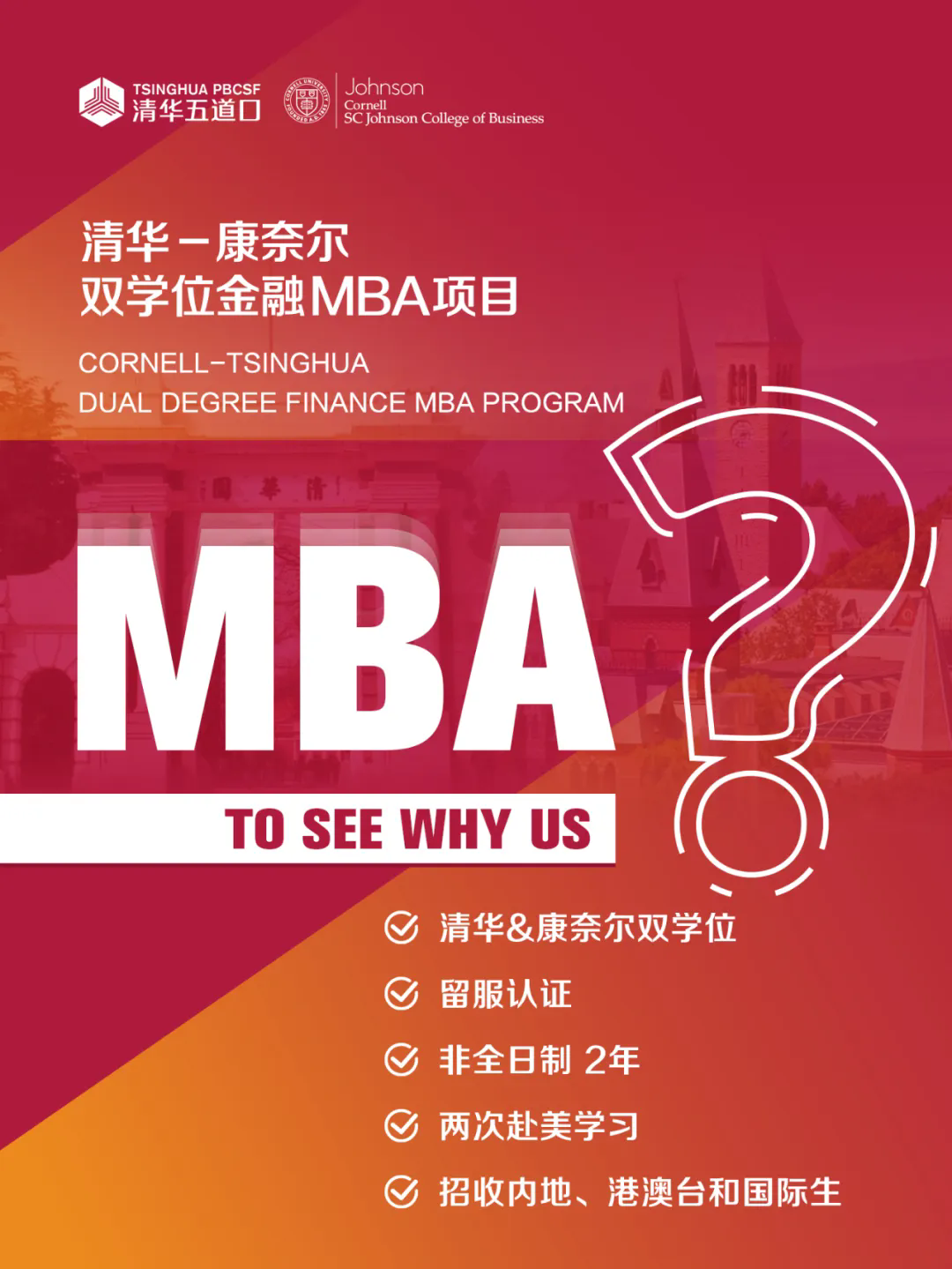 清华-康奈尔双学位金融 MBA 是清华大学五道口金融学院与美国常春藤盟校之一康奈尔大学旗下的约翰逊管理学院联合培养的非全日制项目,同时也是常春藤联盟大学首次在中国授予其原版工商管理(MBA)学位。项目依托清华大学和康奈尔大学两所世界名校一百多年来丰厚的教学资源,放眼国际金融市场,结合中国国情,倾力打造出一套融汇中外金融理论与最新实践的金融人才培育体系,培养立足中国市场、兼具国际视野、精通专业知识的复合型金融领军人才。