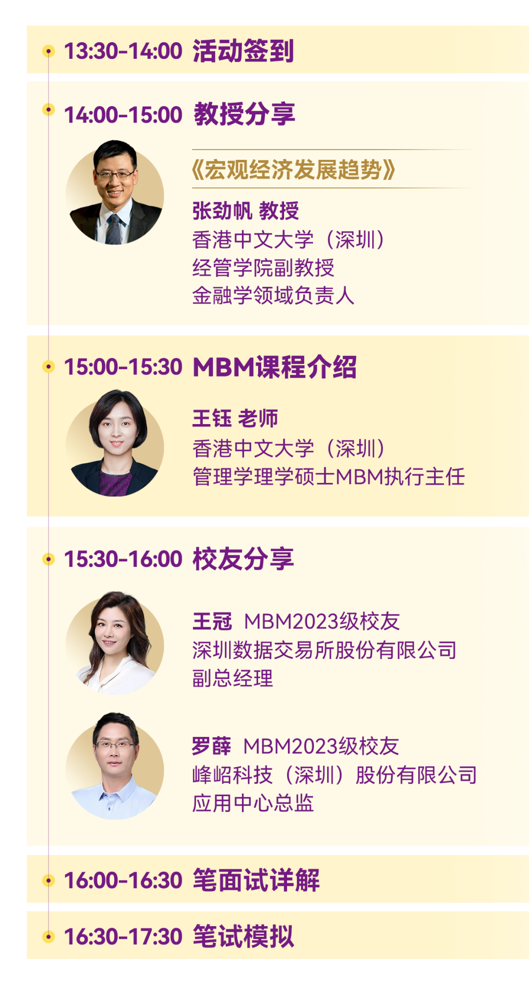 1. 香港中文大学(深圳)管理学理学硕士MBM2026级公开课暨招生说明会仅供申请者与项目交流、增进对项目的了解。本次体验营活动与MBM2026级招生考试及招生录取结果无关。