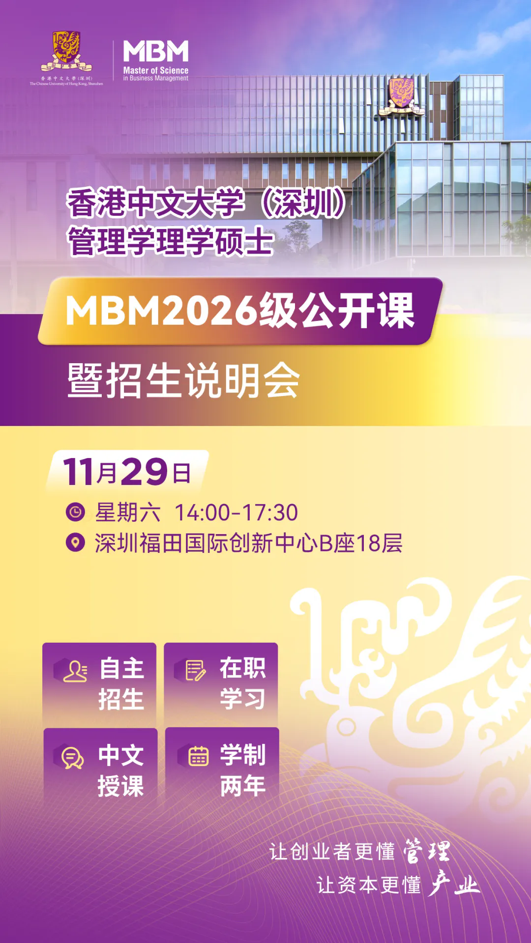 香港中文大学(深圳)管理学理学硕士MBM2026级公开课暨招生说明会即将再度启航,时间为2025年11月29日(星期六)14:00-17:30。