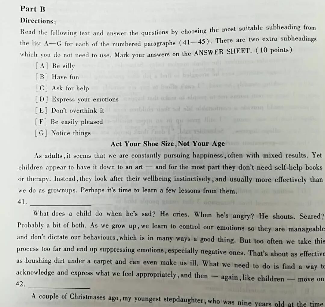 阅读part B 部分只考两种题型,满分10分,每年从两种题型里面找一种题型进行考察,其中之一叫标题匹配,比如一篇长文,可能有7段话,或者6段,选择其中5段,让你给每段话选个小标题,这叫标题匹配。