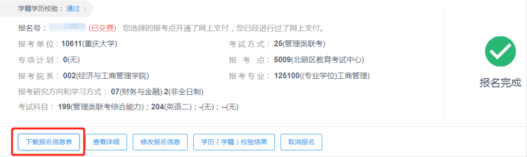 报名完成后,考生请务必点击“下载报名信息表”进行保存。