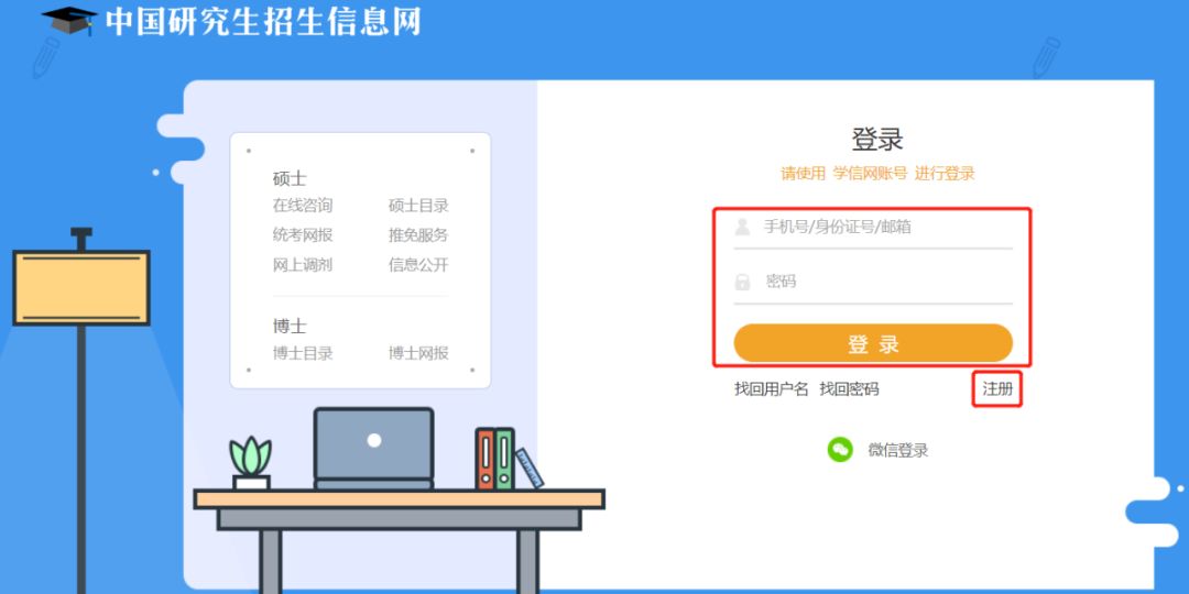 研招网用学信网(https://www.chsi.com.cn)账号密码登录,实名注册,已有账号则直接登录。