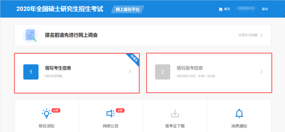 今年研招网报系统优化了报考步骤,将网报分为“填写考生信息”和“填写报考信息”两大步骤。“填写报考信息”在报名时进行。以下为2020年研招网报重要信息及时间节点。