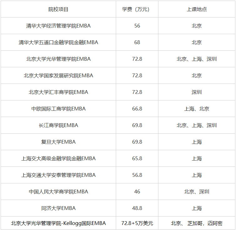 其中学费最高的是北京大学光华管理学院-Kellogg国际EMBA,是72.8万元+5万美元。总学费为108.1万元。