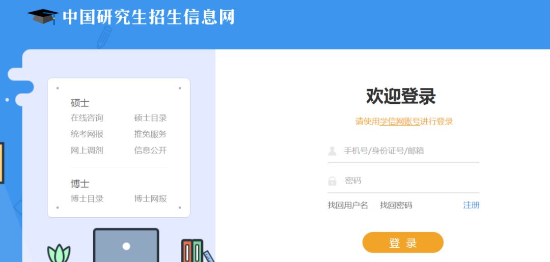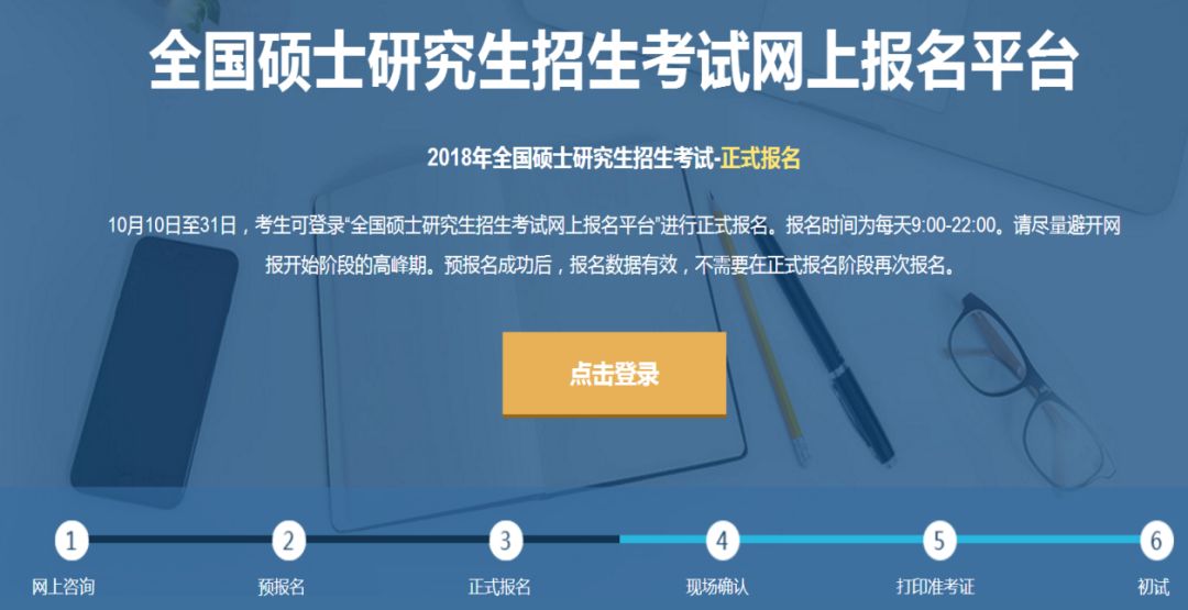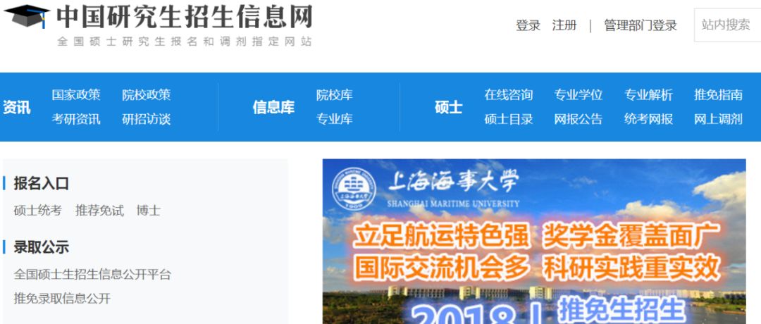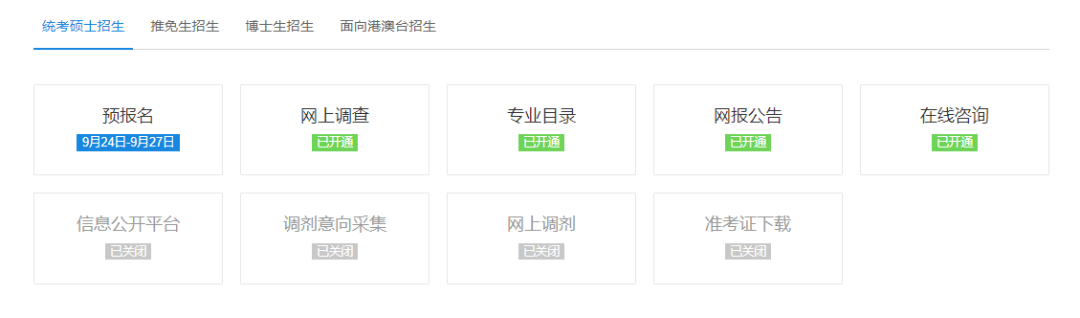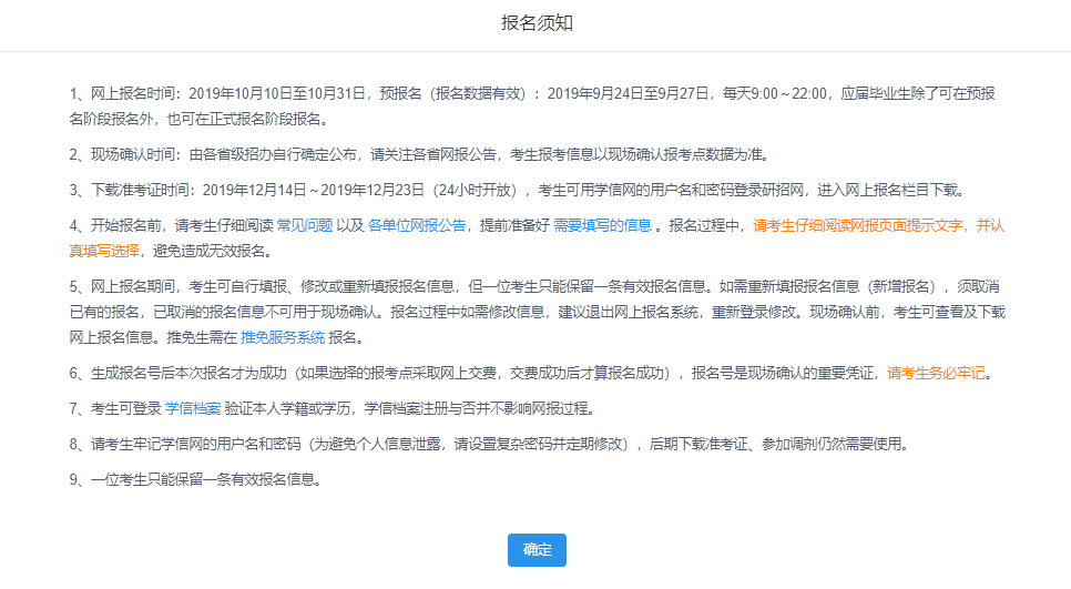 请于预报名阶段2019年9月24至27日(每天9:00-22:00)或正式报名阶段(2019年10月10日至31日9:00-22:00),登录中国研究生招生信息网:http://yz.chsi.com.cn进行网上预报名。
