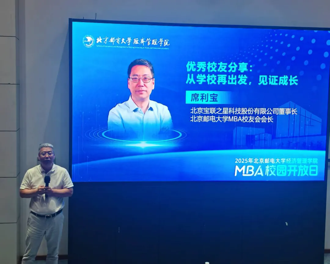 在优秀校友分享环节,北京宝联之星科技股份有限公司董事长、北邮MBA校友会会长席利宝师兄,分享了自身的学习与职业发展经历。他以“从学校再出发,见证成长”为主题,讲述了如何将MBA所学应用于实际工作,实现从技术骨干到管理者的转型。他的故事生动展现了北邮MBA在职业发展中的助推作用,引发了现场学员的强烈共鸣。