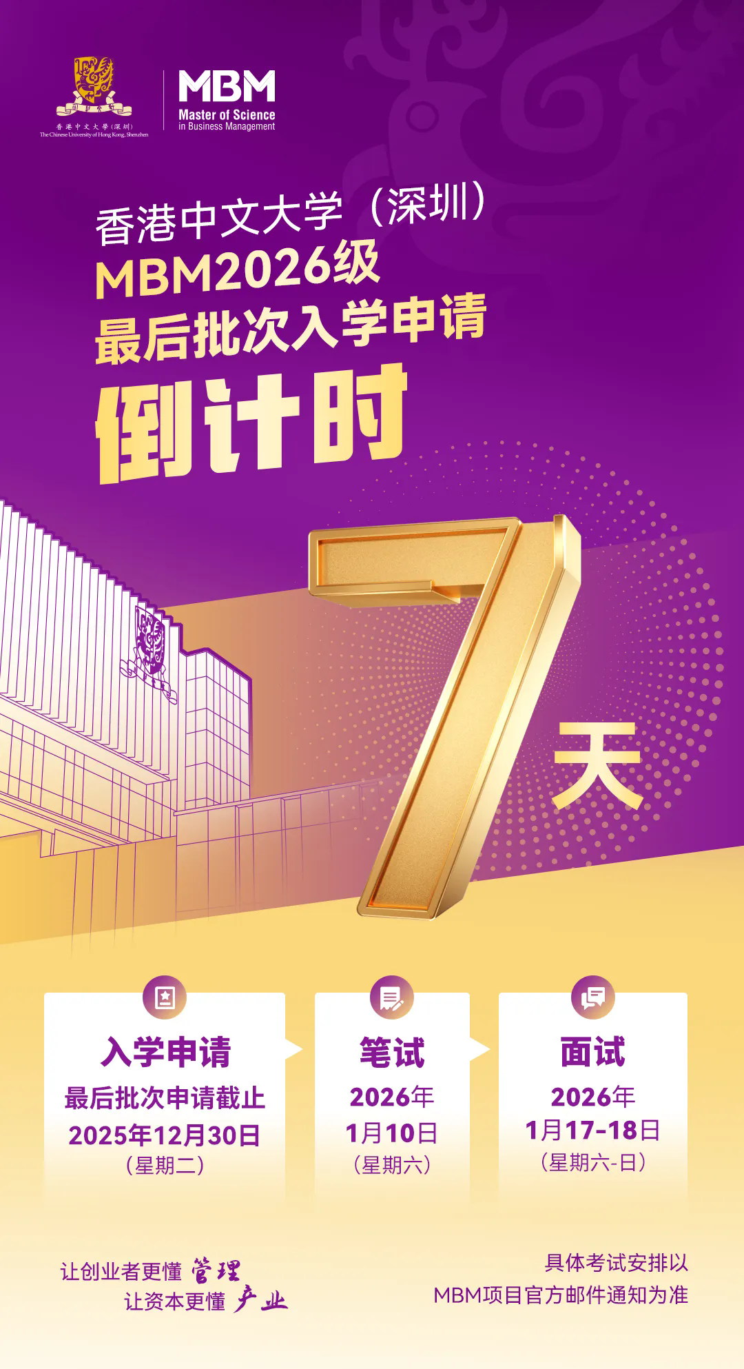 Last Call!港中大深圳MBM2026级入学申请将于12月30日截止