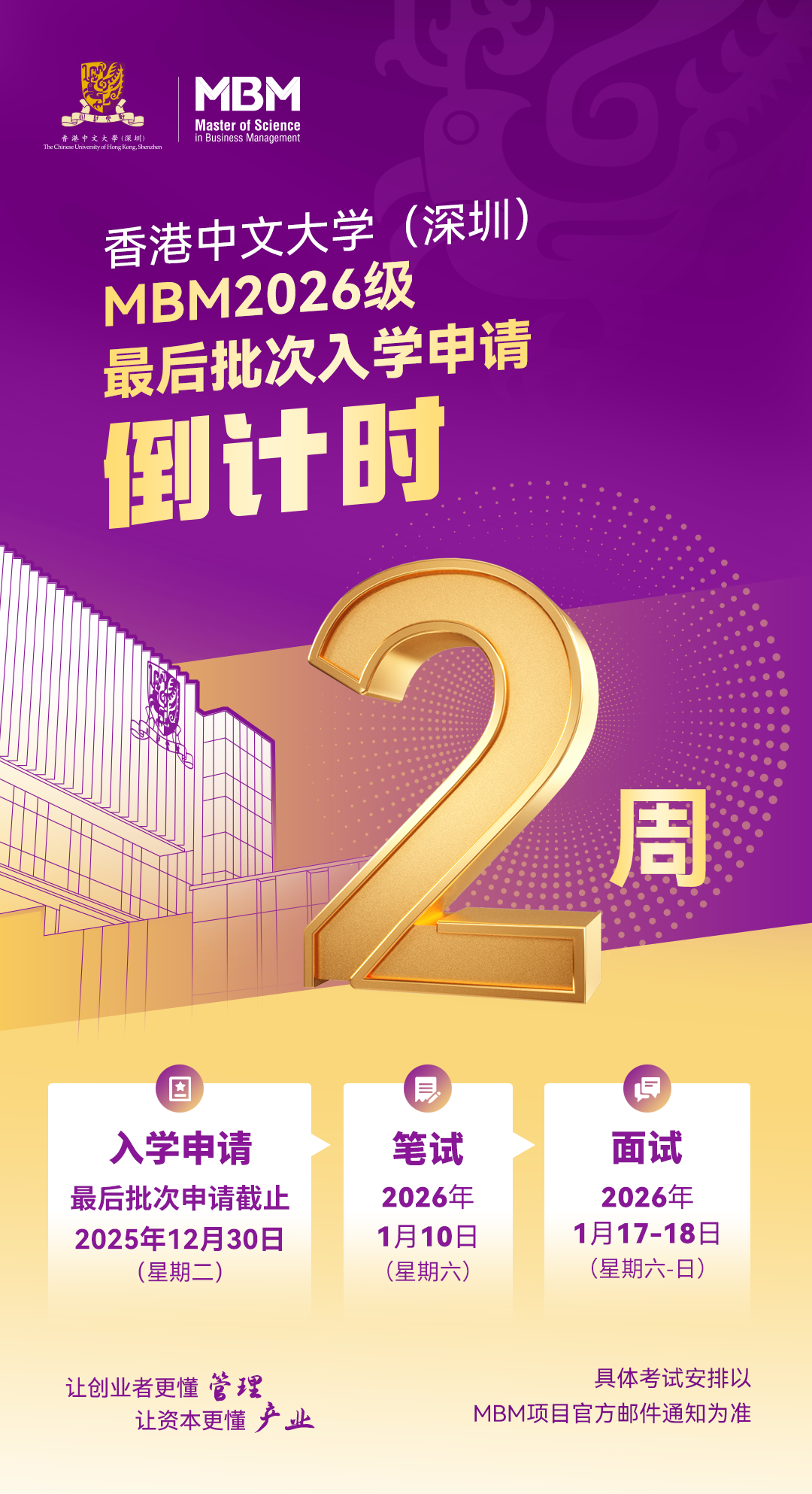 倒计时2周!香港中文大学(深圳)管理学理学硕士MBM2026级最后批次入学申请截止时间为2025年12月30日(星期二)24:00。