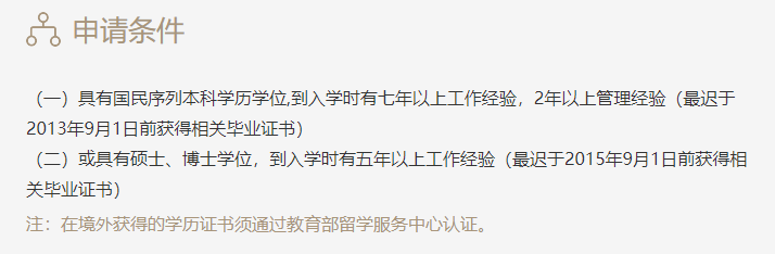 1、具有国民序列本科学历学位,到入学时有七年以上工作经验,2年以上管理经验(最迟于2013年9月1日前获得相关毕业证书)。