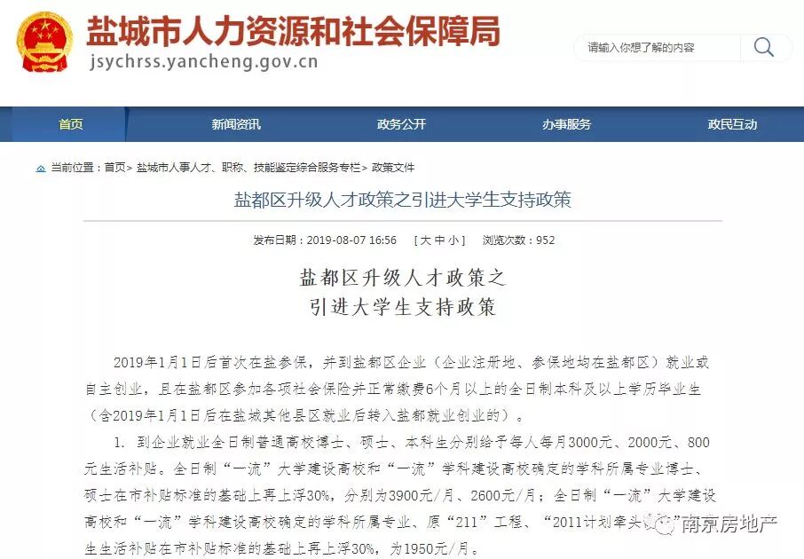 盐城市人力资源和社会保障局发布了“盐都区升级人才政策之引进大学生支持政策”。本科以上有各种补贴,交通补贴,住房补贴,买房补贴、专业补贴、奖励资助等等。