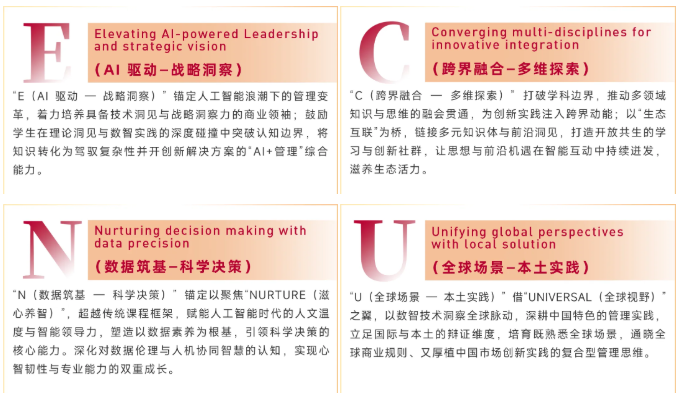 华东师范大学MBA项目培养理念,以 “E、C、N、U” 为核心框架,构建起 AI时代商业人才的培育矩阵。这一体系环环相扣、协同发力,彰显华东师大在商学教育中对时代需求的精准回应,致力于培养出能驾驭技术变革、引领创新实践、兼具格局与根基的新时代商业管理者。