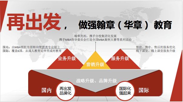 在营销方面,翰章(华章)教育携手分校集团化发展,携手全国MBA指导委员会打造全国MBA商业案例大赛等系列活动,以达到精准营销的目的。在业务方面,翰章教育由MBA领航全面转向管理类联考硕士,并增加国际项目,目前已覆盖六国,从成人教育延伸至成材教育。在服务方面,优化售前、售中、售后的服务质量,“线上+线下”的课堂服务体系全面升级。