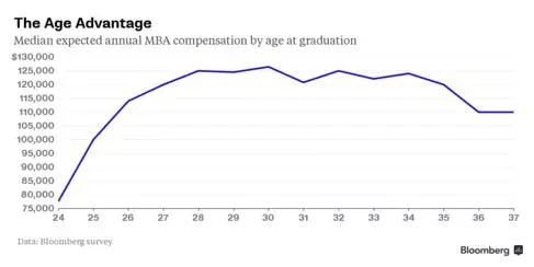 可以看出,以28岁为分界线,28岁前,随着年龄增长,MBA毕业后薪酬水平越高;30岁达到巅峰;28到34岁,毕业后薪酬在12万美元左右徘徊;而到了36-37岁毕业,薪水则跌至11万美元。