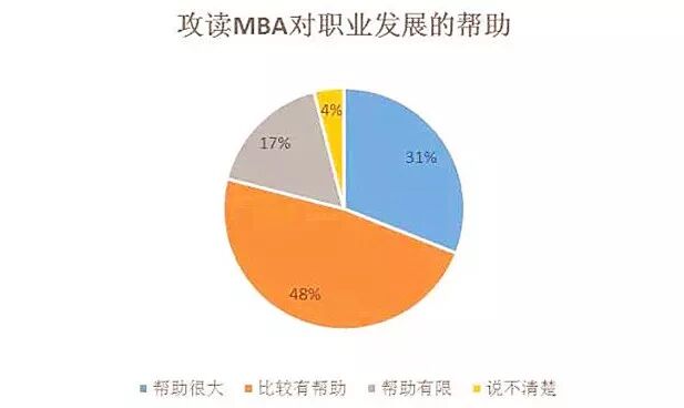 79%毕业生认为攻读MBA对职业发展是有帮助的,其中31%的人表示帮助很大。