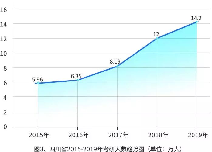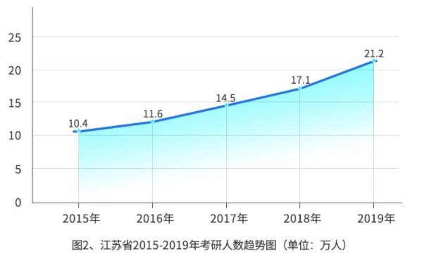 各大省份考研人士,不断翻番,江苏省从2015年的10.4万人到2019年的21.2万人,其余四川,广州,福建等省市也在不断增幅。