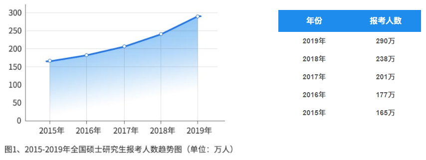 根据上图显示,近5年考研人数逐年增长,同2015年的165万人相比增加了125万人,研究生报考人数的快速上涨也引发了社会的广泛关注。
