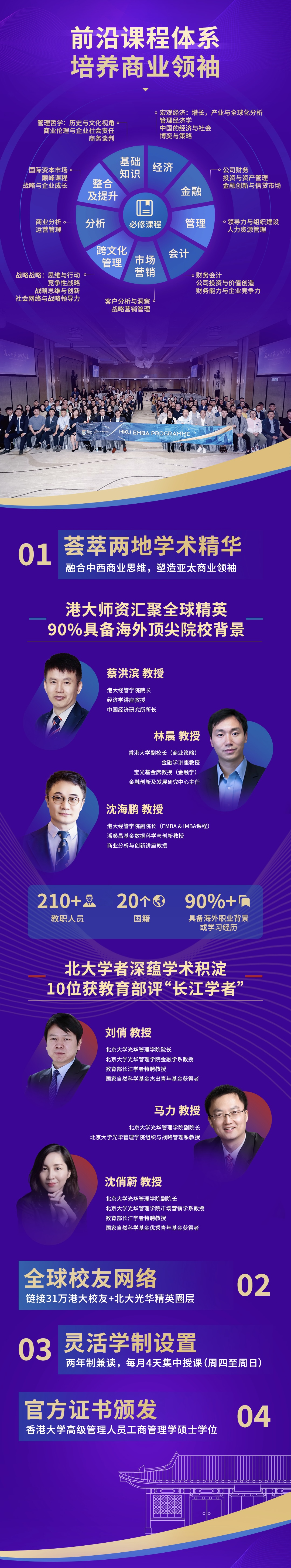 ⾹港⼤学EMBA综合班为具有丰富管理经验的⾼级管理⼈员⽽设,课程为两年兼读制项⽬,计划于2026年9⽉开班。授课师资主要来⾃⾹港⼤学经济及⼯商管理学院,其中包括在⾹港⼤学担任荣誉教授的北京⼤学光华管理学院的资深教授进⾏教学。课程结合中国内地和⾹港的学术思想精华,以国际视野聚焦亚太区域,并采⽤跨学科的教学⽅式,为各界领军⼈⼠提供优秀的商业教育和前沿的商业及⾦融知识。学员在成功修完课程后,将获颁发⾹港⼤学⾼级管理⼈员⼯商管理学硕⼠学位。