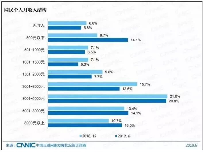 个人收入结构上,超过7成网友月收入不足5000。其中无收入及月收入在500元以下的网民群体占比为19.9%,月收入在2001-5000元的网民群体合计占比超过三分之一,为33.4%;月收入在5000元以上的网民群体占比为27.2%。