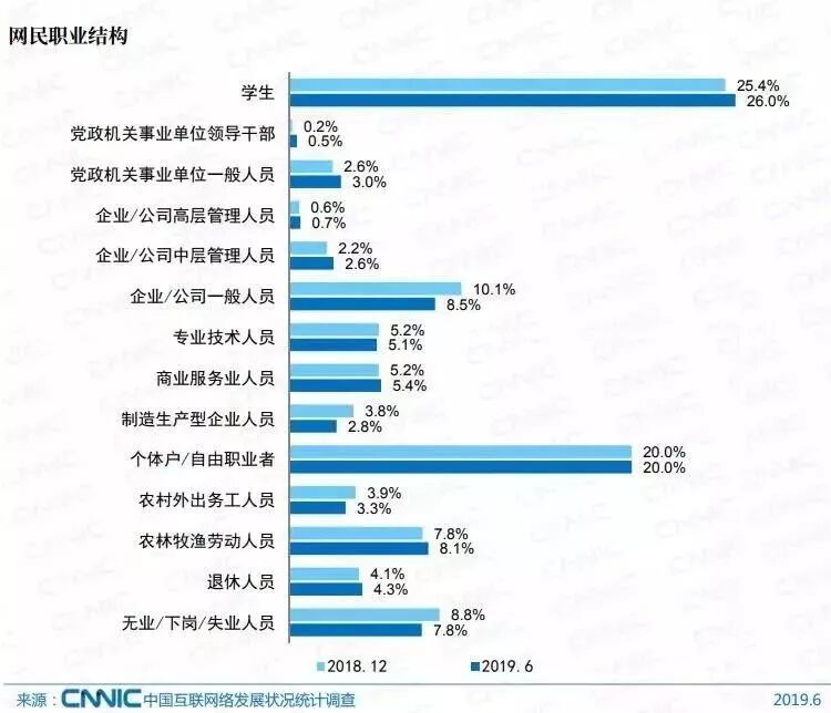 在我国网民群体中,学生最多,占比为26.0%;其次是个体户/自由职业者,占比为20.0%;企业/公司的管理人员和一般人员占比共计11.8%。