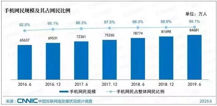 手机网民规模达8.47亿,较2018年底增长2984万,网民中使用手机上网的比例由2018年底的98.6%提升至99.1%。
