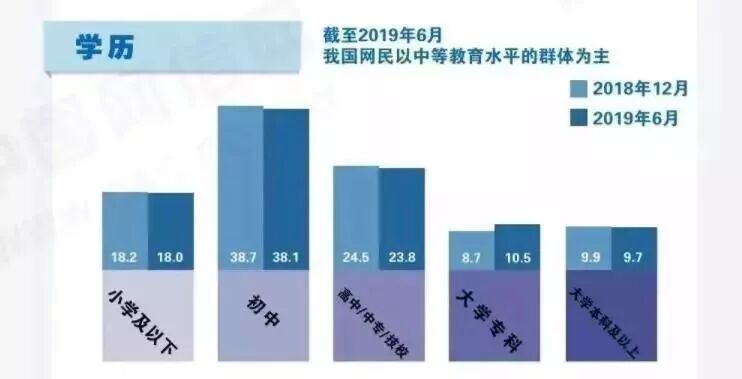 数据显示,近9成中国网民没有上过大学。其中初中、高中/中专/技校学历的网民群体占比分别为38.1%、23.8%;受过大学专科、大学本科及以上教育的网民群体占比分别为10.5%、9.7%。
