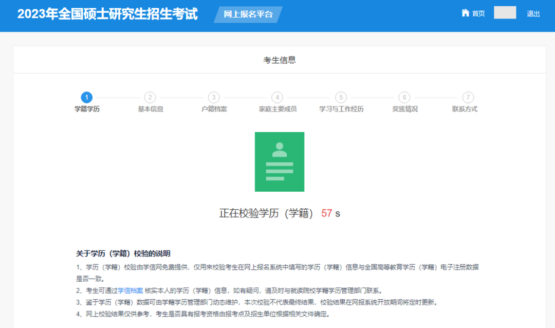 一般情况下,学历(学籍)信息是可以快速校验的。如遇网络拥堵等特殊情况,将出现“进行中”的状态,考生可以继续填写考生信息中的其他部分,不影响接下来的操作。