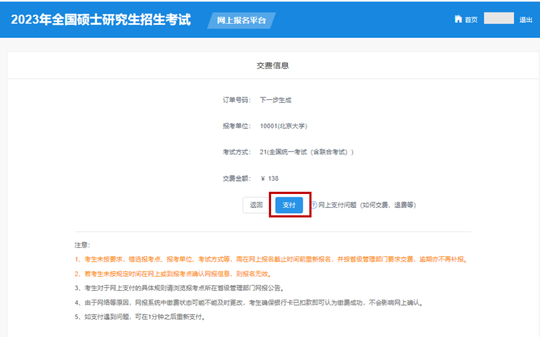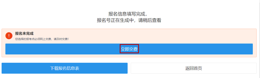 8. 生成报名号后,请牢记报名号,点击立即交费。