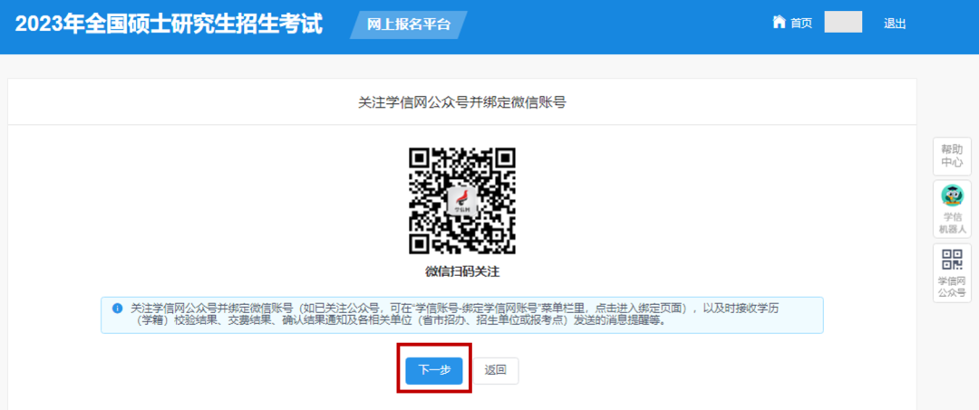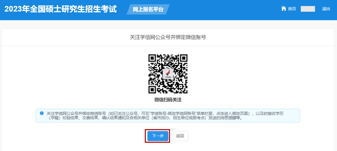 6. 点击确定后进入此页面,请点击【填写考生信息】。扫码关注学信网公众号,点击【下一步】。