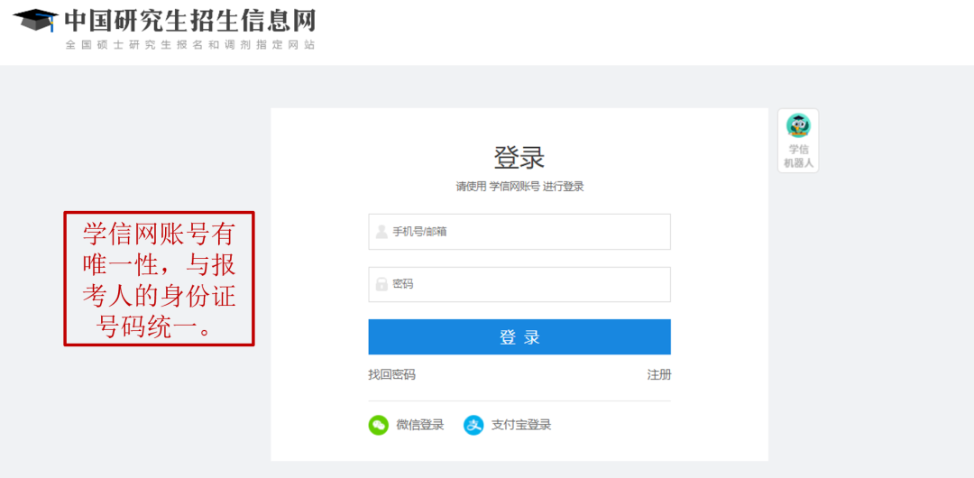 3. 如已有学信网账号请用学信网账号【登录】,如没有账号请用手机号【注册】。——此账号要求【实名认证】,即您需要将个人有效身份证与此账号绑定。