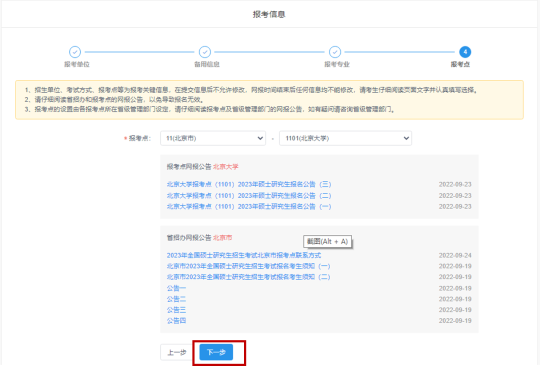6. 填写【报考点】。阅读完网报公告后,点击下一步。