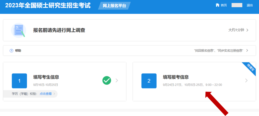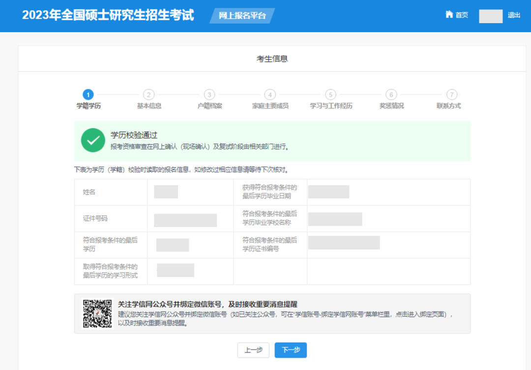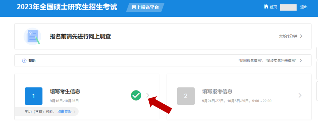 17. 点击返回首页,您会看到,这个页面中第一项【填写考生信息】是完成的状态,并且学籍学历校验,显示通过。