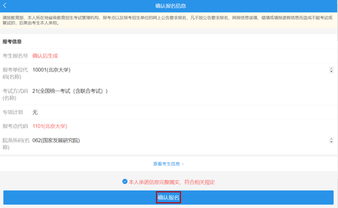 7. 仔细核对所有的报名信息。确认无误后,勾选本人承诺信息完整属实,符合相关规定,点击【确认报名】。*请确认选填信息正确无误,报考信息一旦提交不可修改。