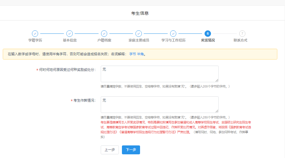 14. 填写完毕后,请点击下一步,进入【奖惩情况】。如无特殊情况,请填无。
