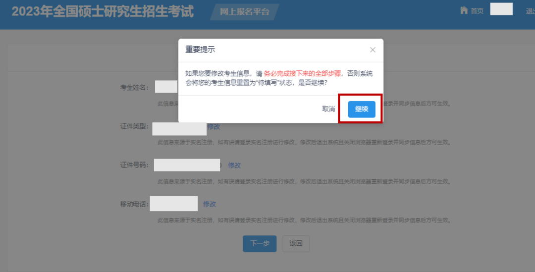 7.点击后进入此页面,请仔细核对您的个人信息,确保无误后,点击【下一步】,选择【继续】。