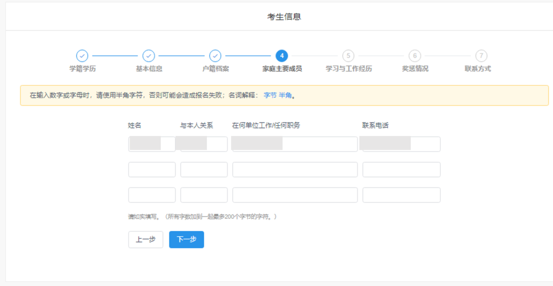 12. 填写完毕后,请点击下一步,进入【家庭主要成员】。此部分至少填写一位家庭成员信息。