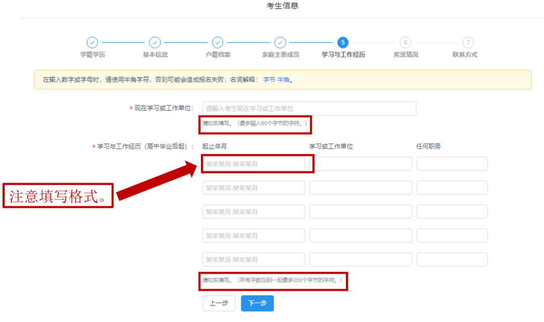 13. 填写完毕后,请点击下一步,进入【学习与工作经历】。