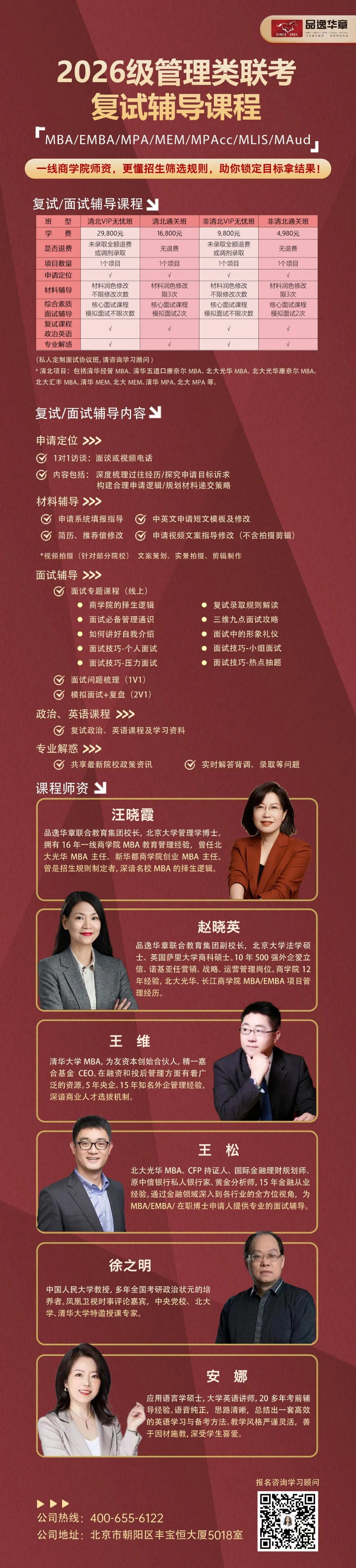 考核形式:英文自我介绍、问答(日常/ 职业 / 热点)、英文案例讨论、朗读与翻译。 考核内容:个人背景、职业规划、MBA 学习目标、行业热点、日常话题(如家乡、爱好); 建议提前准备高频话题的英文素材,多跟读模仿,克服“开口难” 的问题。