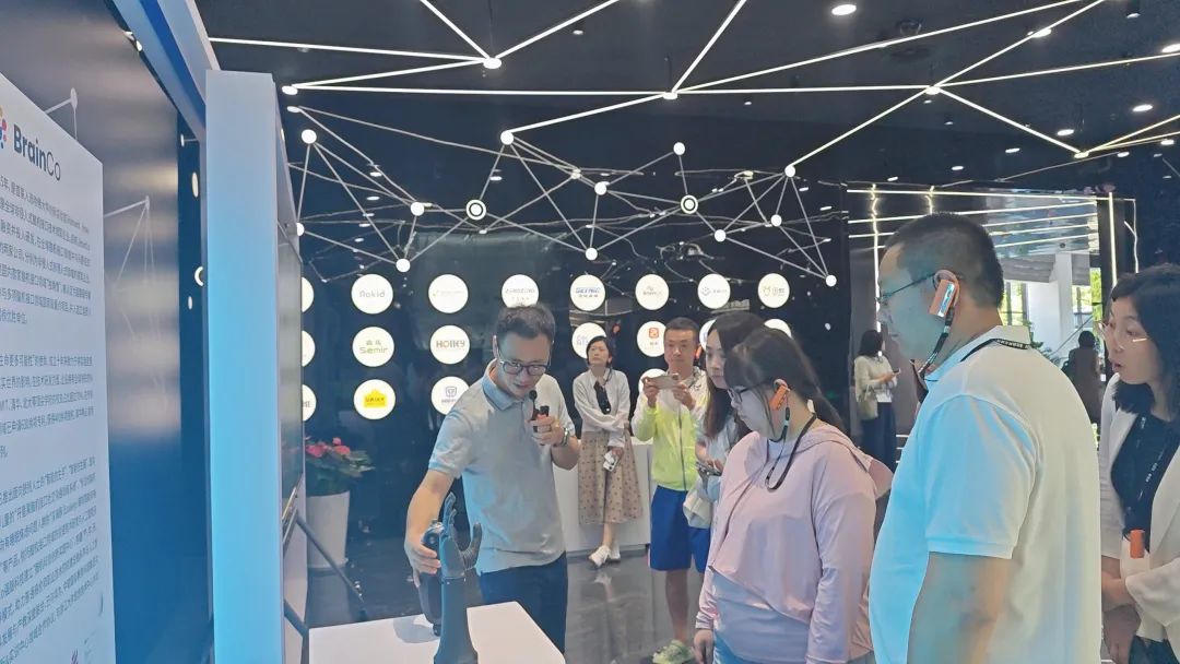 这里详细介绍了群核科技、游戏科学、Deepseek、宇树科技、强脑科技和云深处科技杭州六小龙的核心研究成果,让同学们看到了政企协同创新的“杭州模式”。展区内陈列的非侵入式脑机接口设备等科技成果,更引发了学生们对技术商业化落地的热烈讨论。