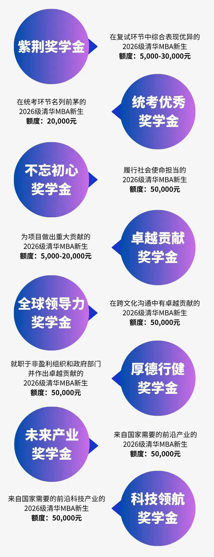 无论是在统考与面试中成绩优异,还是践行社会公益、履行社会使命,投身于国家需要的前沿产业、未来产业,亦或为清华MBA项目做出贡献的新生都能找到对应的“专属奖学金”。