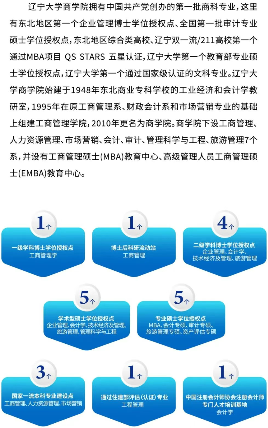辽宁大学MBA项目历史积淀深厚,是全国第三批获得授权点单位,2004年成为辽宁省委组织部唯一指定的工商管理专业人才培训项目合作单位,是东北地区社会经济管理人才培养的主要基地之一。
