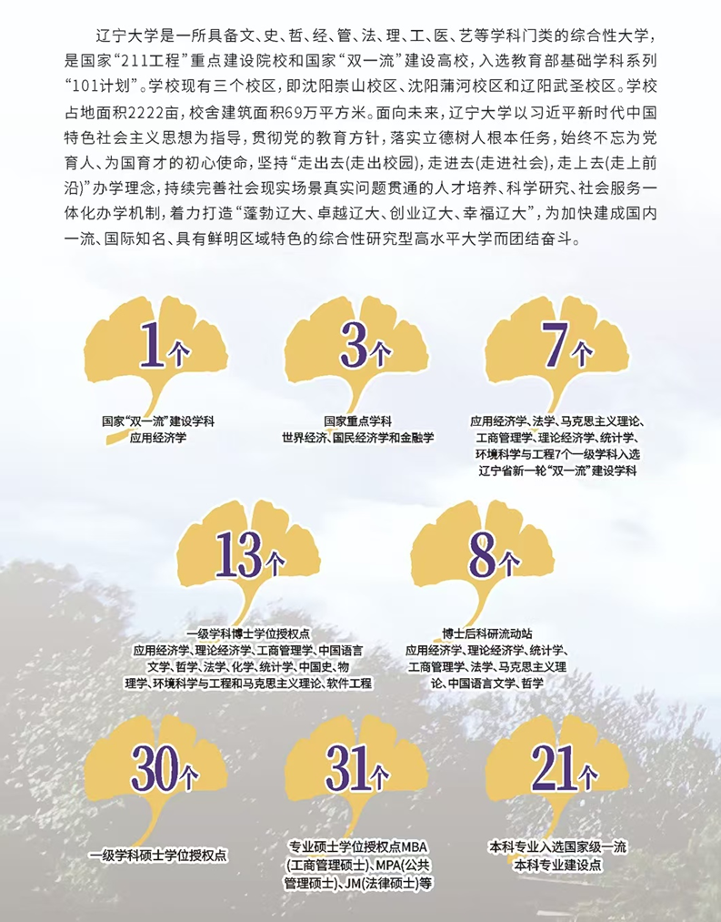 辽宁大学MBA项目始终秉承“明德精学、笃行致强”的校训精神,依托学校深厚的学术底蕴和资源优势,致力于培养具有国际视野、创新精神和社会责任感的高层次管理人才。自1998年首批招生以来,辽宁大学MBA项目已累计培养5000余名复合型管理人才。毕业生广泛就职于银行、证券、会计师事务所、大型企业、高等学校、政府部门等领域,为东北老工业基地振兴提供了重要的人才支撑。